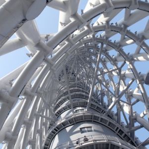 廣州塔由一座454米的塔身和156米的鋼結(jié)構(gòu)桅桿組成,總高610米。塔身由鋼結(jié)構(gòu)外框筒和鋼筋混凝土核心筒構(gòu)成。內(nèi)外框筒通過(guò)樓層結(jié)構(gòu)相連,但樓層缺失一半。焊接工作是廣州塔項(xiàng)目高難度工作之一,鋼結(jié)構(gòu)外筒均采用鋼管構(gòu)件,高空節(jié)點(diǎn)均為等強(qiáng)焊接連接。從保證焊接質(zhì)量、提高焊接功效、減少焊